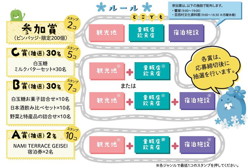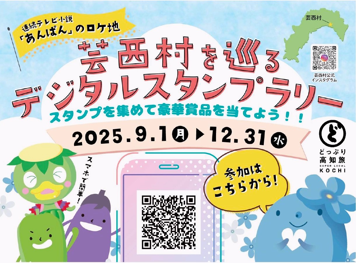 芸西村の中にあるポイント対象施設を巡り、決められた数のデジタルスタンプを集めて、参加賞や各賞の抽選に応募しよう!