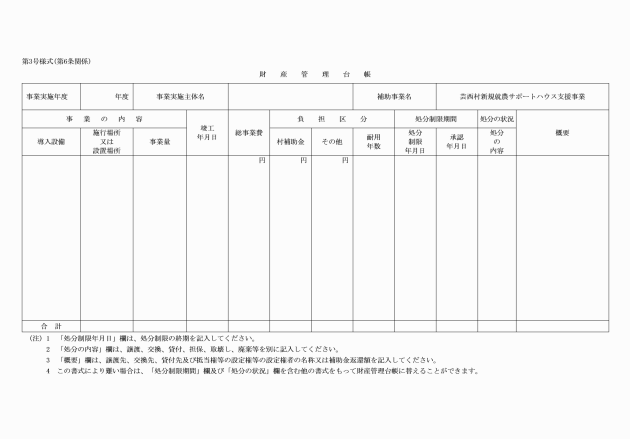 (4) 補助事業により取得した財産(施設、機械及び器具をいう。)で処分制限期間を経過していないものは、別記第3号様式による財産管理台帳及びその他の関係書類を保管すること。