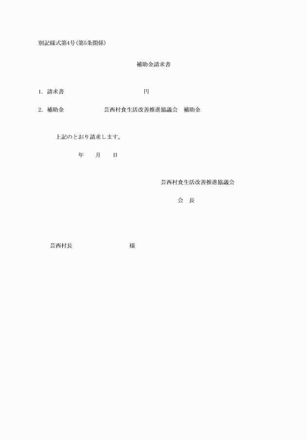 第3条 芸西村食生活改善推進協議会は、事業に先だって、補助金交付申請書(別記様式第1号)に事業実施計画書、収支予算書を添付して村長に提出しなければならない。